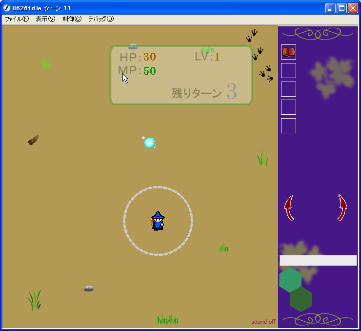 ウィル・オー・ウィスプさんです。 ミニデビルさんの行動スクリプトをいじっただけなので、簡単にできました。 1,2時間でモンスターとプログラムを作れれば、上出来ではないでしょうか。 ゲームバランスは追々考えるとして、次は中ボスさん。 中ボスさんは、こっちに近づいてから攻撃するというパターンなので、新しくプログラムを作らなくてはいけません。 後々応用できるから、頑張って作ろう。